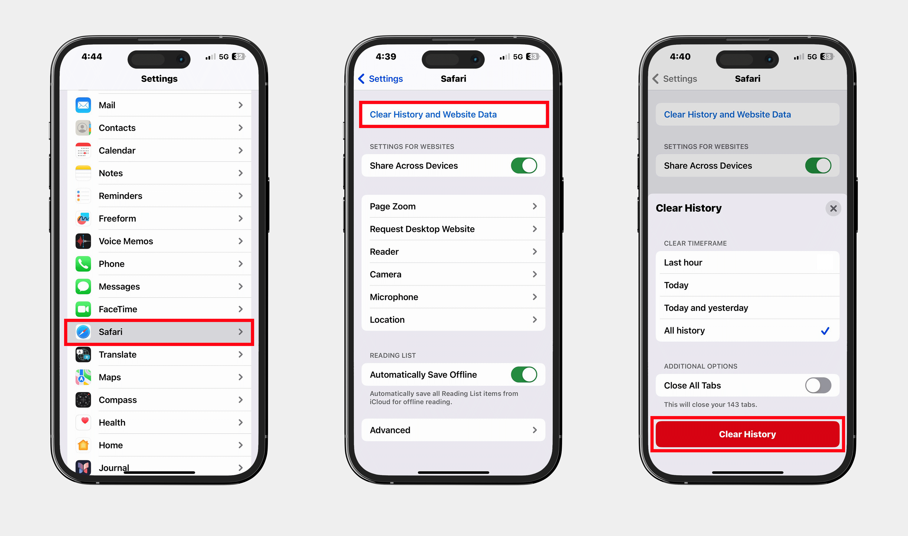 2. Scroll down, then select Clear History and Website Data.